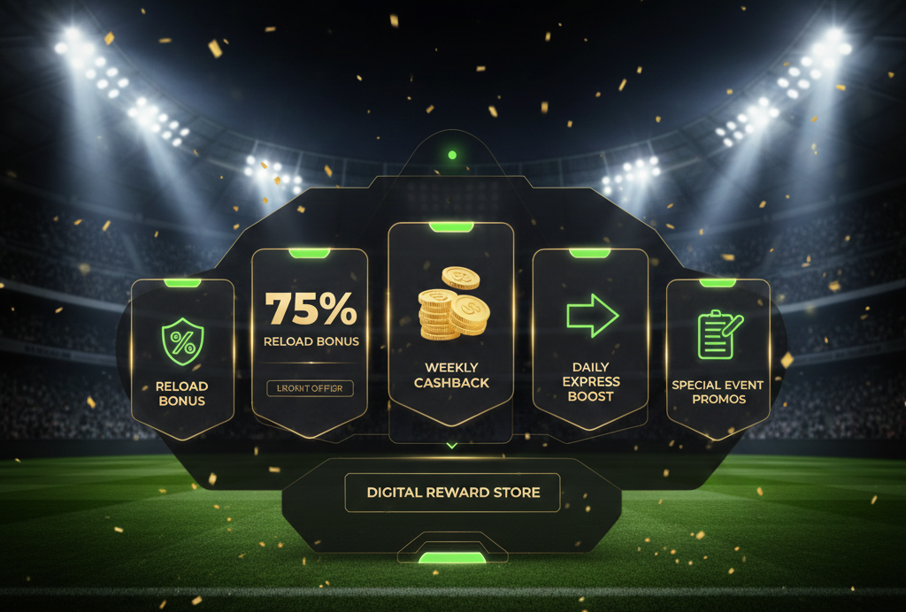 Saturday 75% reload to €200; 3% weekly loss cashback; Daily Express with 10% extra; event-tied specials; Promo Store for custom free bets.
