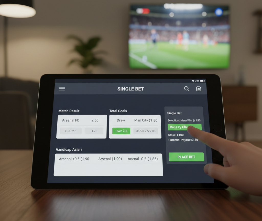 Basic predictions on one match element, like outcomes, totals, handicaps. Wins pay out on success.